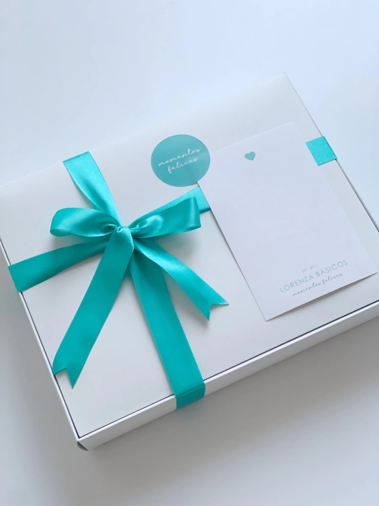 VIene dentro de una cajita con papel de seda y un tarjetón listo para regalar.