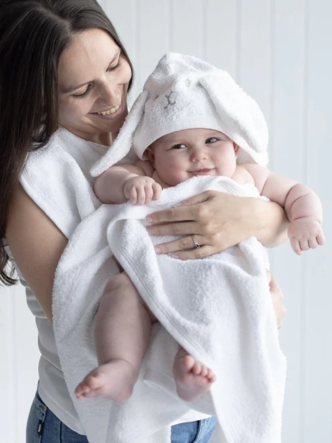 Tiene una correa para colgártelo del cuello, dejando tus manos libres para sostener y sacar a tu bebé del agua con total seguridad y comodidad, sin desatenderlo ni un segundo. Al quedar colgado por delante de tu cuerpo, también te protege a vos y evita que te mojes. Además, es enorme y tiene una capucha divina con orejitas y carita de conejito.